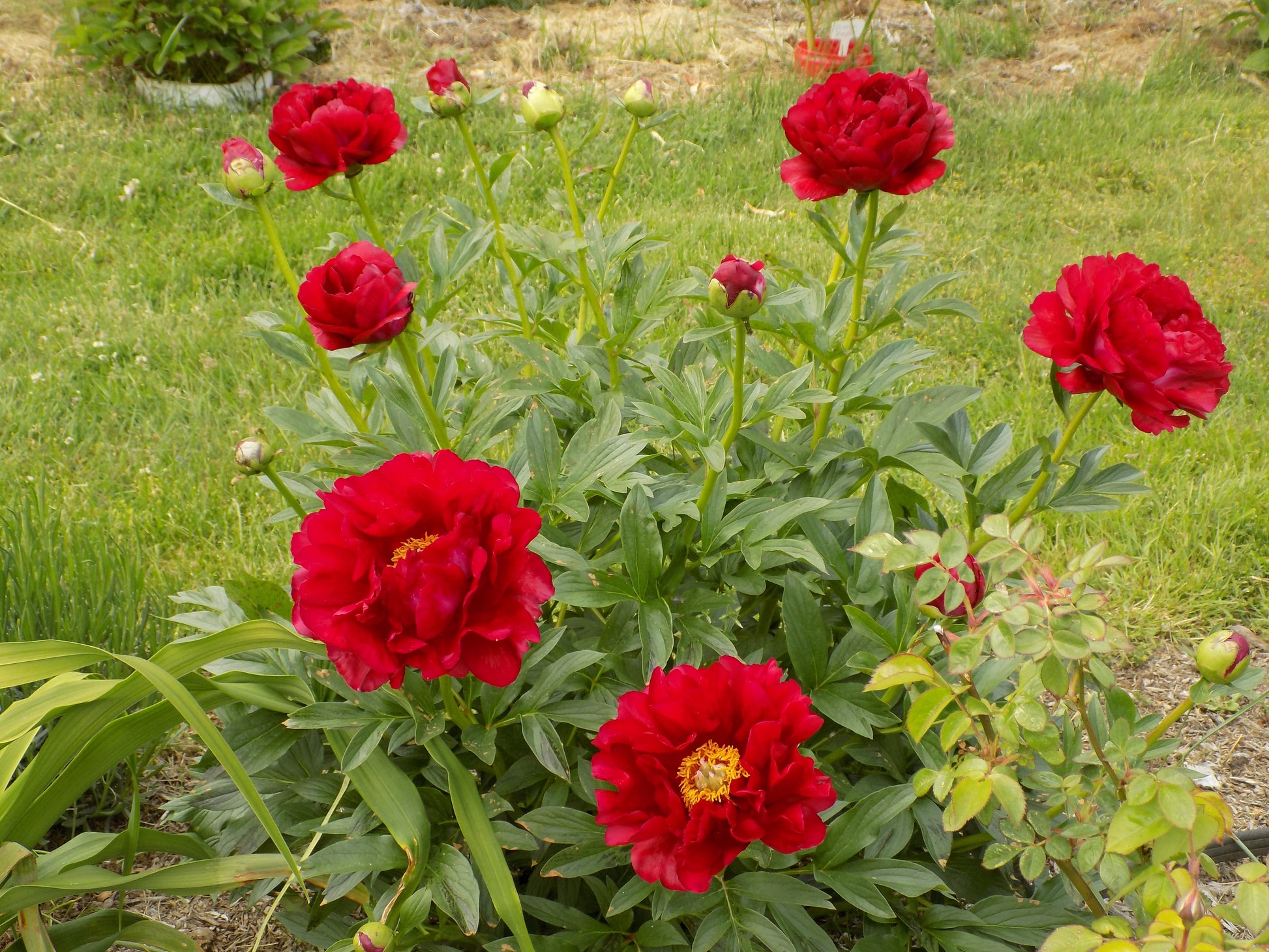 Deep red color peony with semi-doubles flowers, decorated in the center by golden stamens. The flowers keep their color along all time of the flowering. This cheerful blossoms are held nicely on mint green, lush foliage on the strong stems.