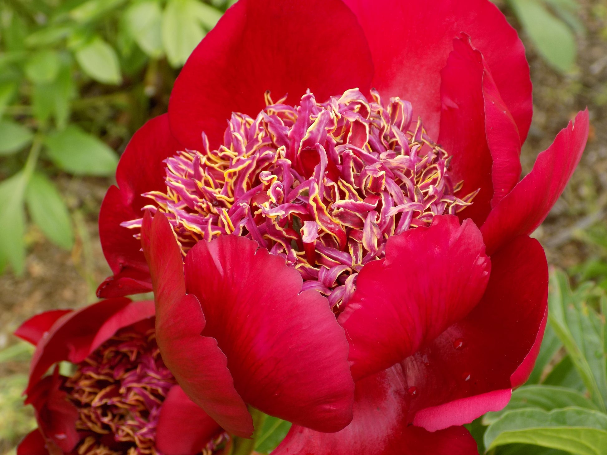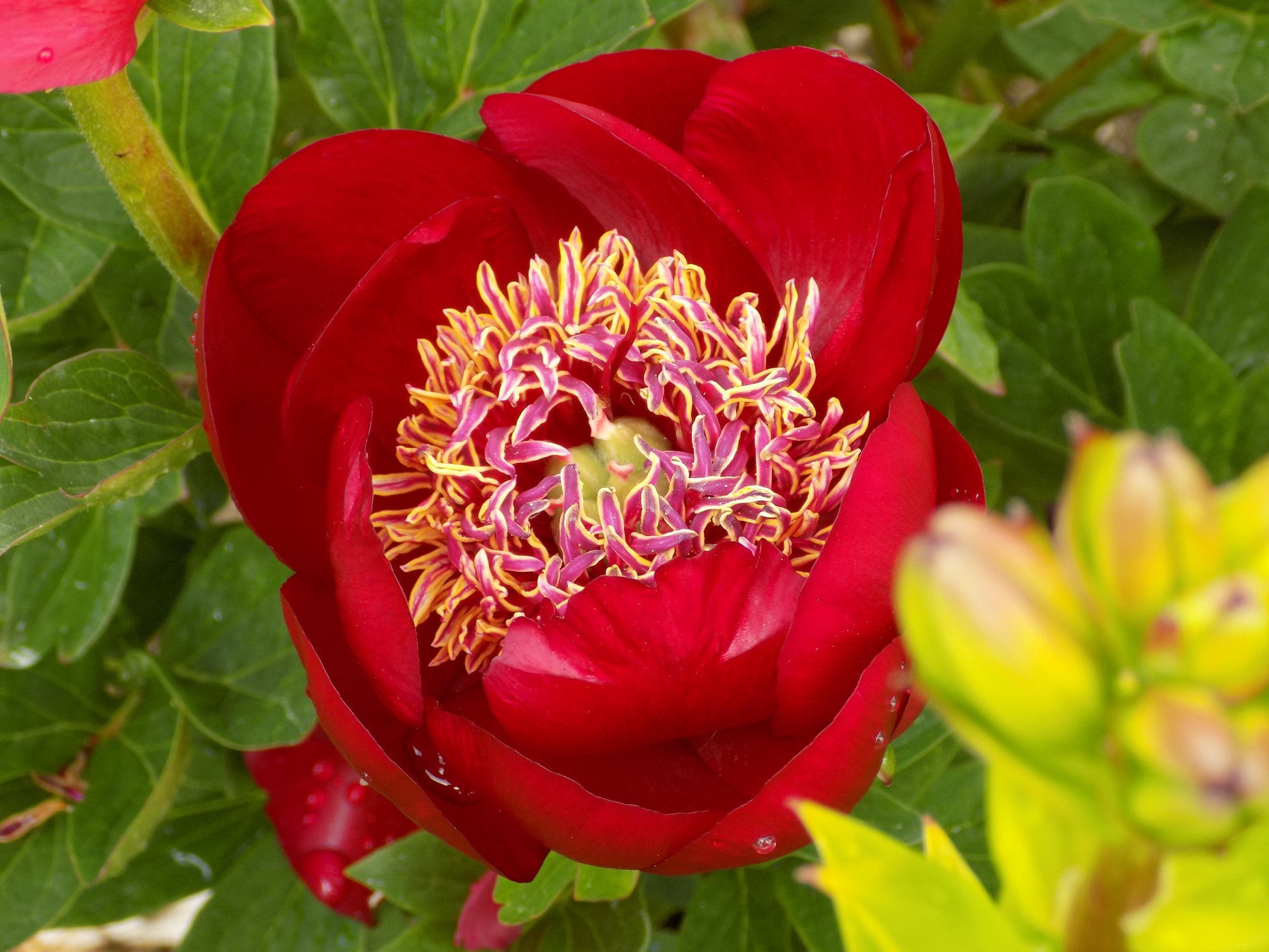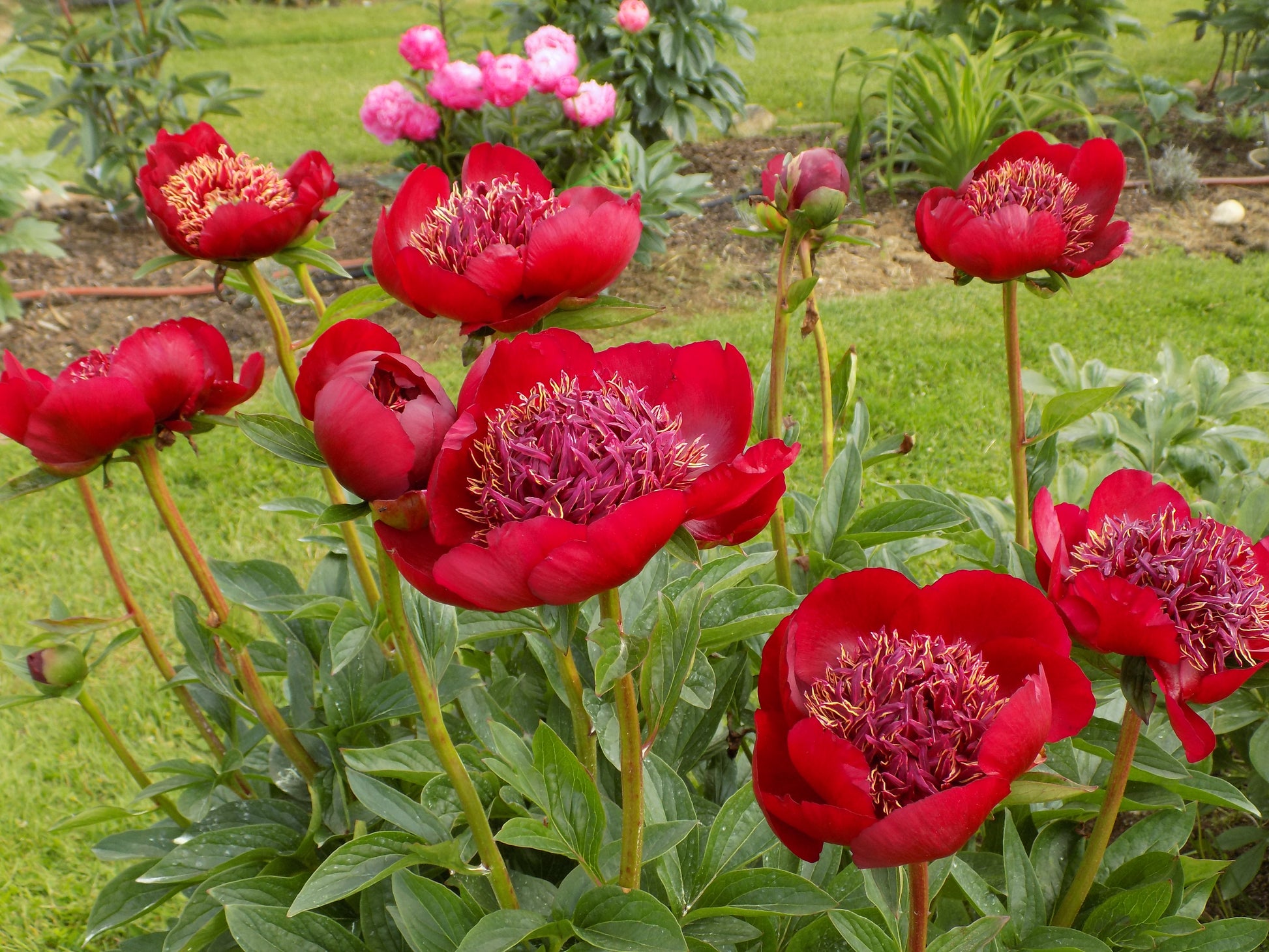 Beautiful, burgundy-red flowers on the sturdy, medium height stem. It is a real eye catching peony in the garden. Always so neat and reliable bloomer. Japanese form flowers with the golden staminodes that stops people in their tracks. American Peony Society Gold Medal winner in 1974.